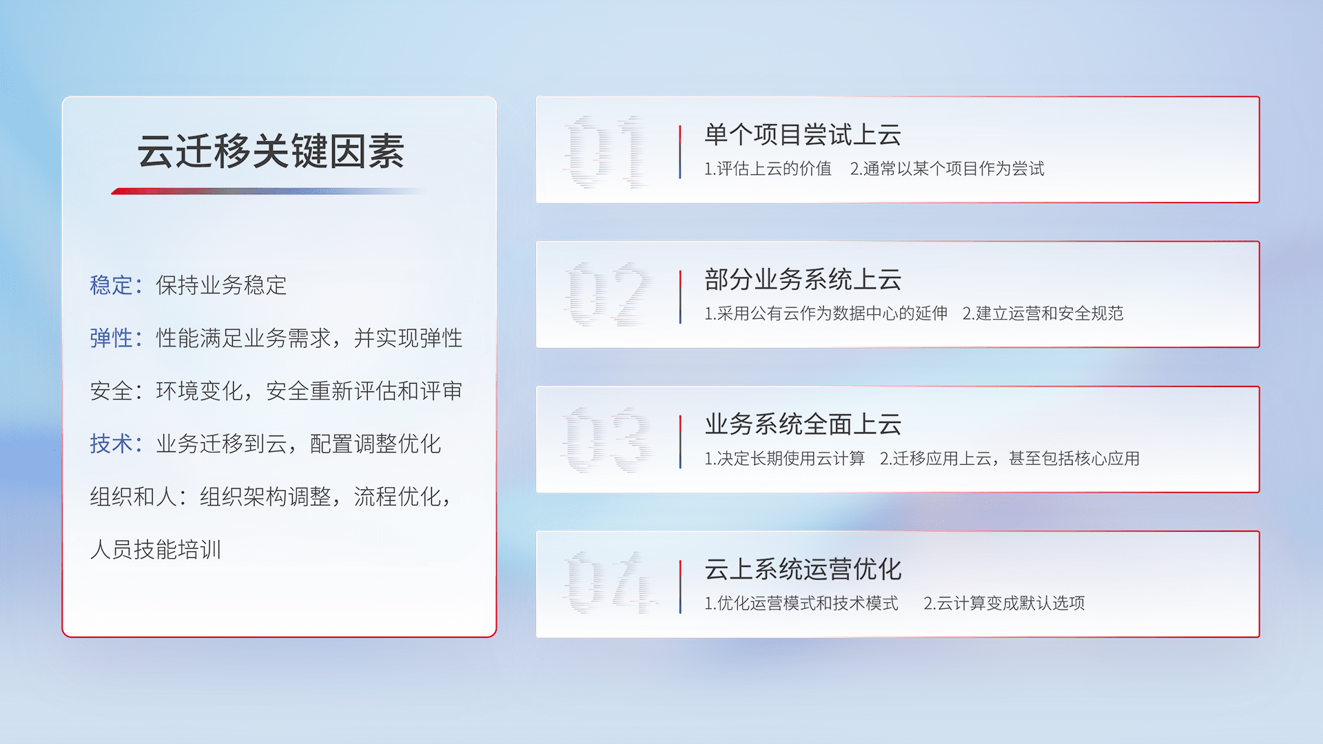 结合实际业务,,,,从规划设计、、、云平台选型、、云原生改造、、数据迁移、、、集成交付,,迁移全过程为客户识别最佳上云路径,,做好风险识别管理,,,设计网络架构、、身份权限、、安全审计合规、、、、操作审计、、日志审计、、、监控告警策略、、多站点容灾设计等,,,,对云上基础设施进行整体规划,,,,提升IT治理水平,,,以满足弹性、、、、高可用、、、高性能的需求。。。。